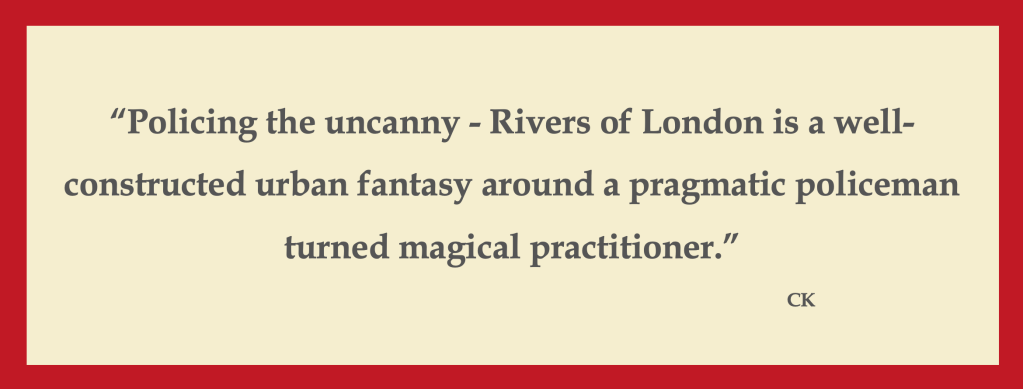 The first we learn of it, is when Police Constable Peter Grant is out and about, trying to take a witness statement. From a ghost. Now Peter doesn’t know that anything supernatural or magical exists in the world, prior to that evening. He is a policeman doing police work. But once he realizes that he has just conversed with a ghost, he has an amazing train of thought that I hope I would have if confronted with anything inexplicably. It goes somewhat like this: Ghosts aren’t real. I must be crazy. But I’m not crazy. So, I guess ghosts are real. Let’s roll with that.